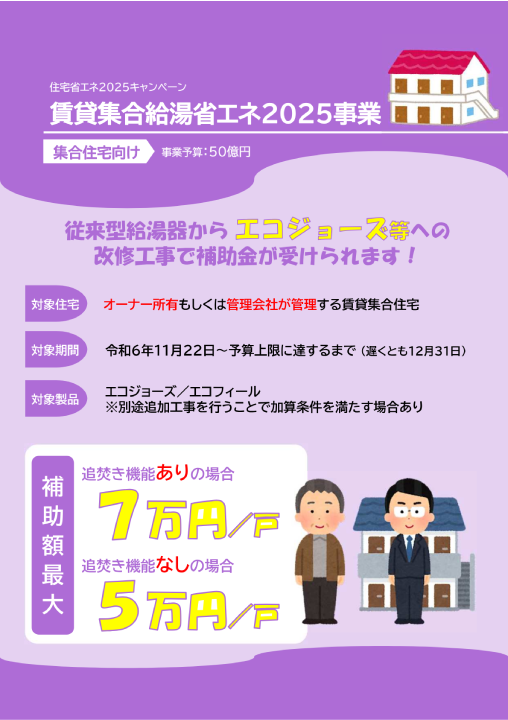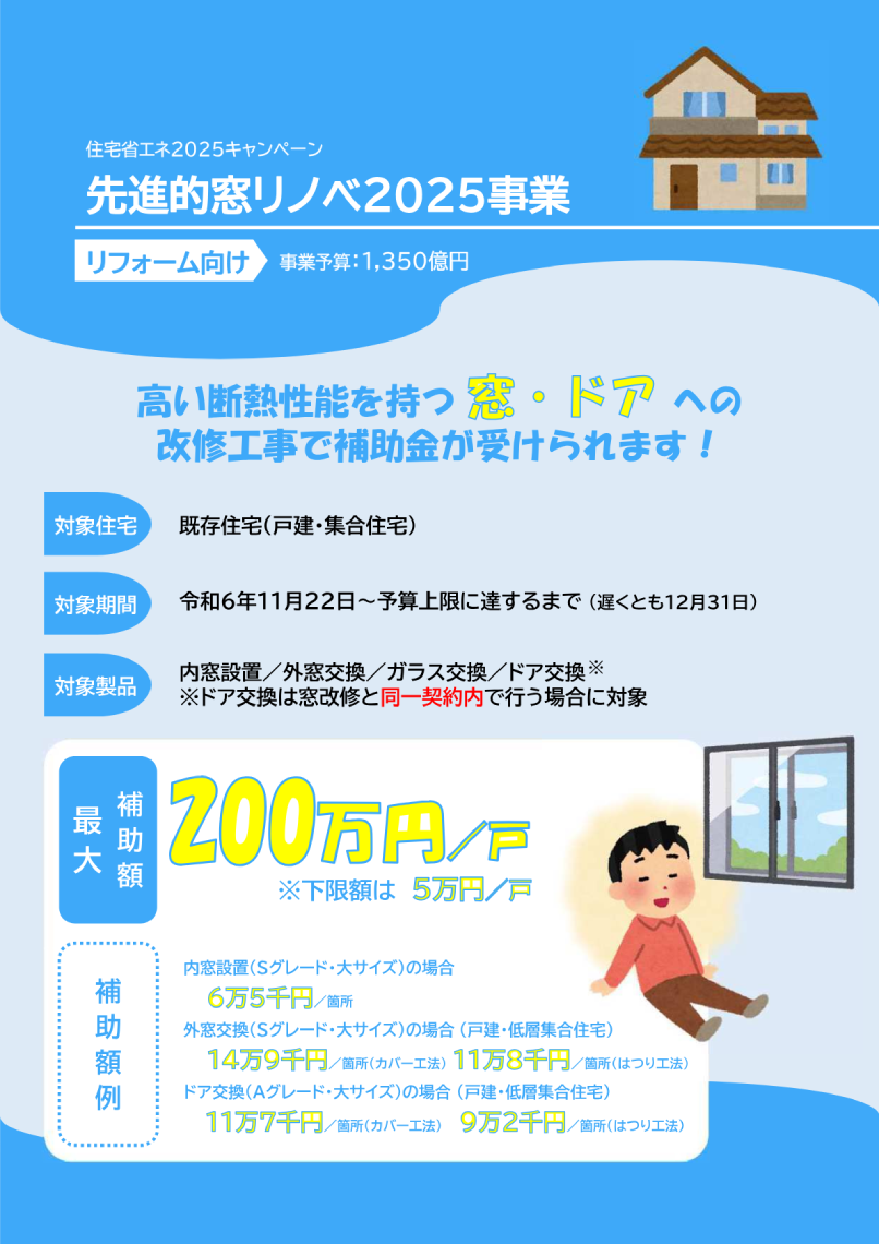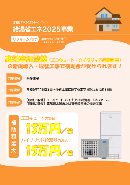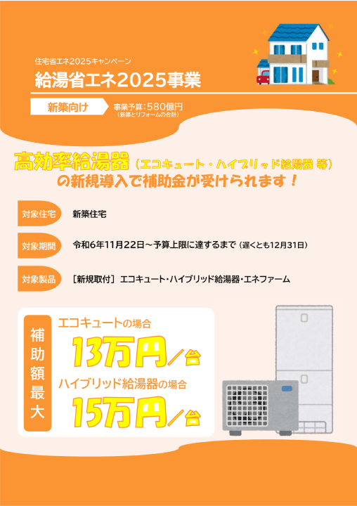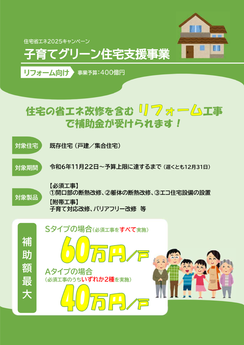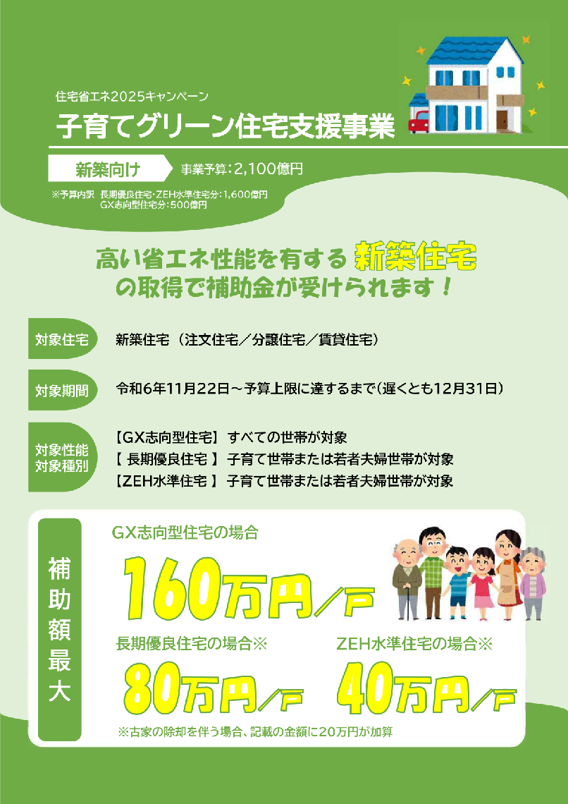 小泉北関東でお取扱い可能な補助金申請一覧 住宅省エネ2025キャンペーン 子育てグリーン(新築) ~最大160万円/戸~ 子育てグリーン(リフォーム) ~最大60万円/戸~ 先進的窓リノベ ~最大200万円/戸~ 給湯省エネ事業(新築) ~最大15万円/戸~ 給湯省エネ事業(リフォーム) ~最大15万円/戸~ 賃貸集合給湯省エネ ~最大7万円/戸~