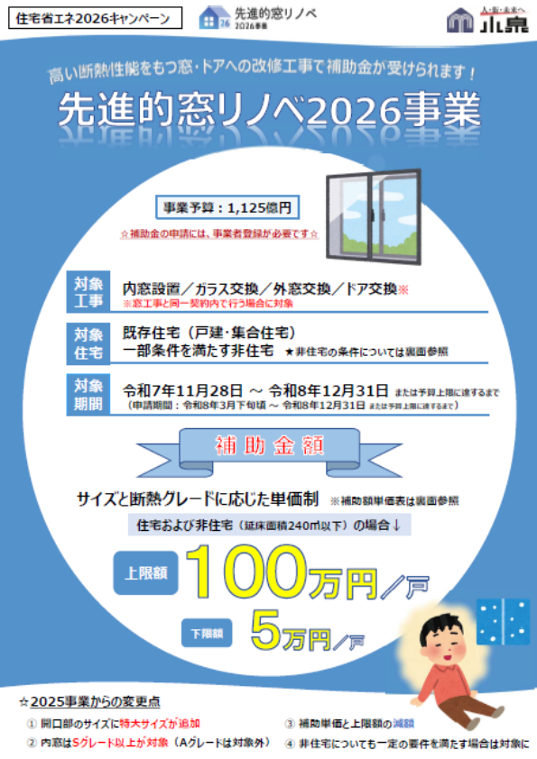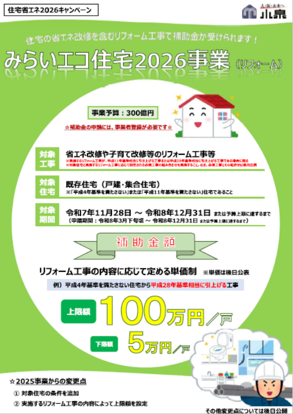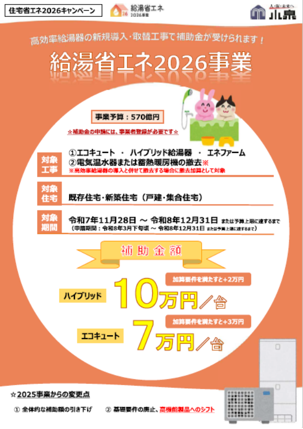 小泉北関東でお取扱い可能な補助金申請一覧 住宅省エネ2026キャンペーン みらいエコ住宅2026事業(リフォーム)~上限100万円/戸~ 先進的窓リノベ2026事業~上限100万円/戸~ 給湯省エネ2026事業~最大10万円/戸~ 賃貸集合給湯省エネ2026事業~最大7万円/戸~